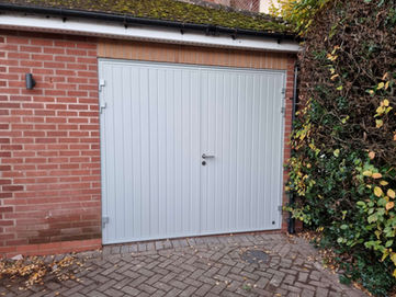 Novoferm vertical up and over door in Anthracite Grey with a white frame